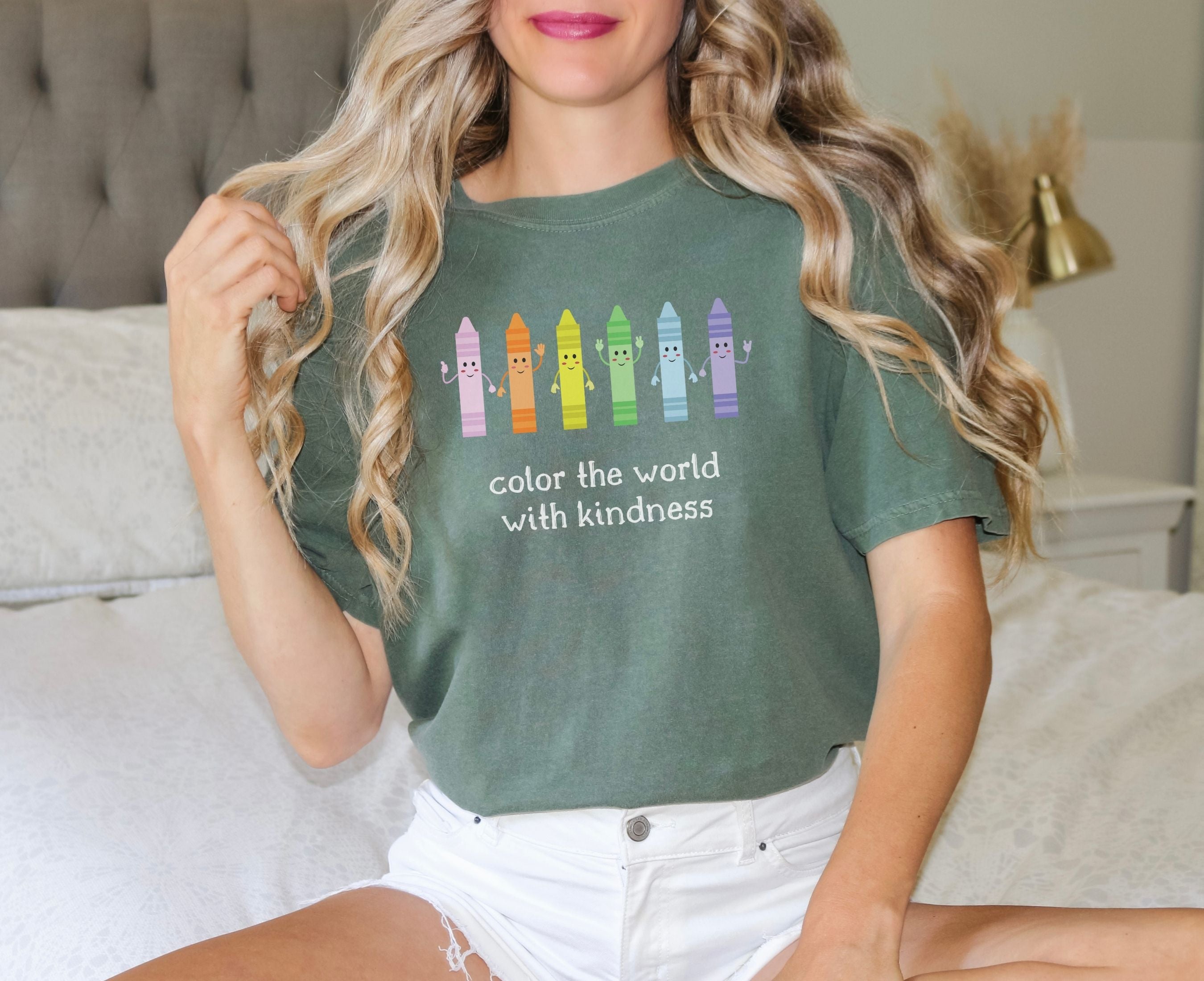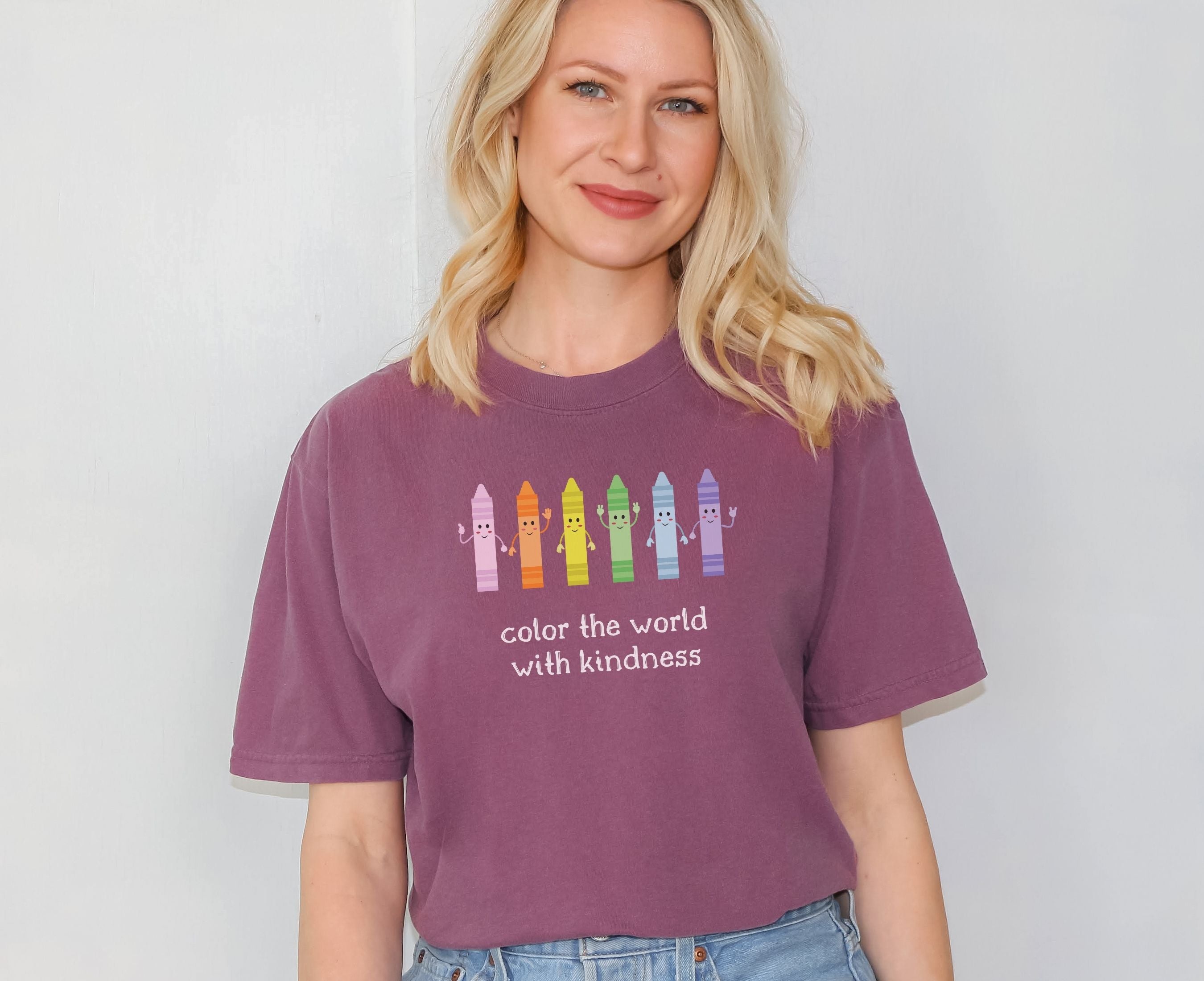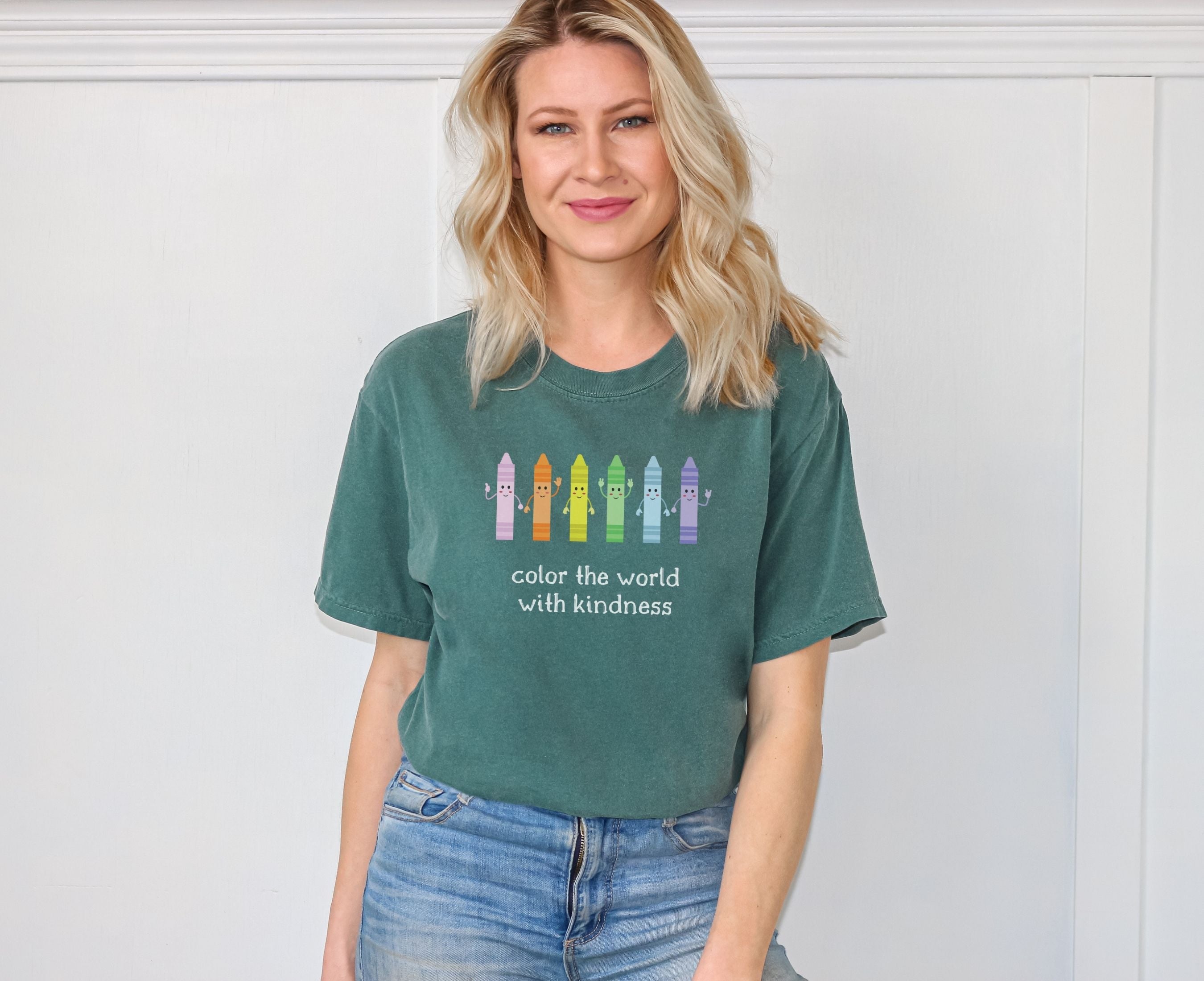 Teacher wearing Mint crayon box character kindness shirt
