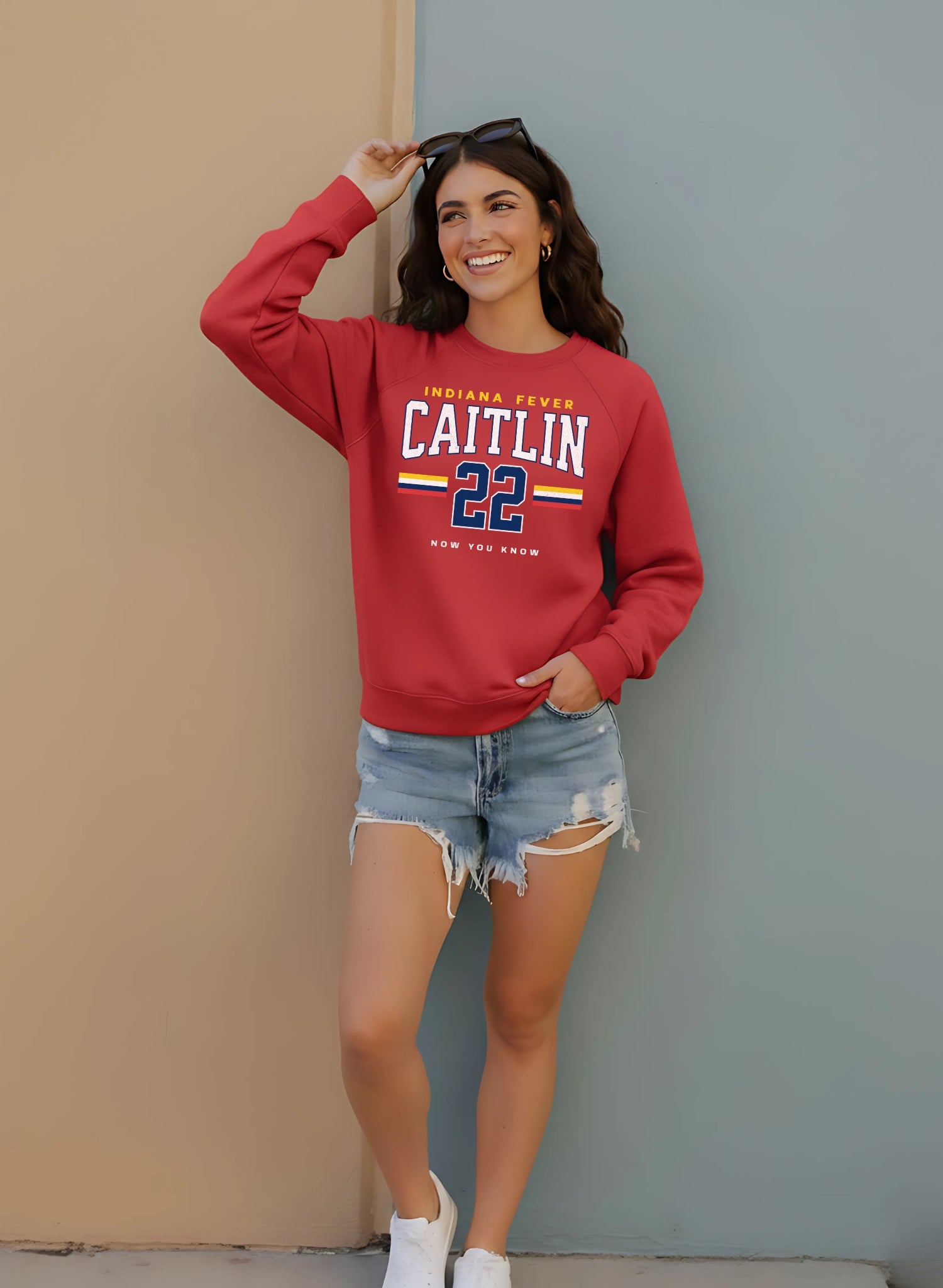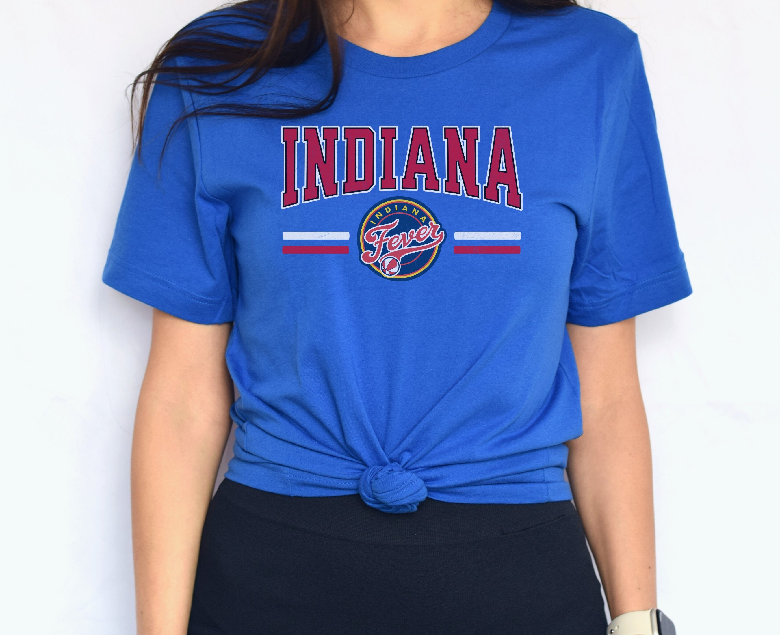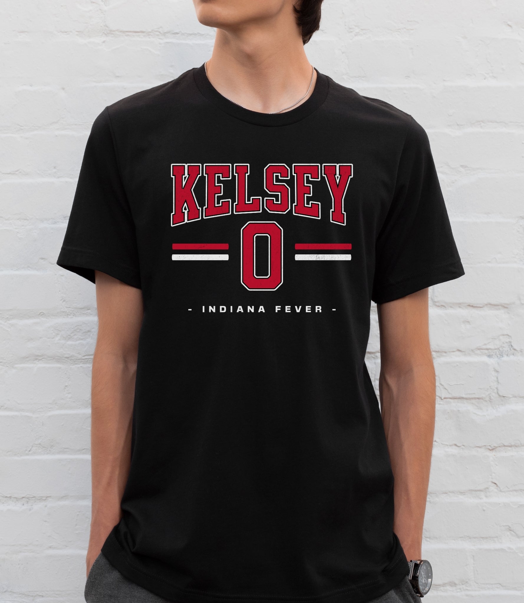 Person wearing a black t-shirt with 'Indiana Fever Caitlin 22 Now You Know' text against a white brick wall.