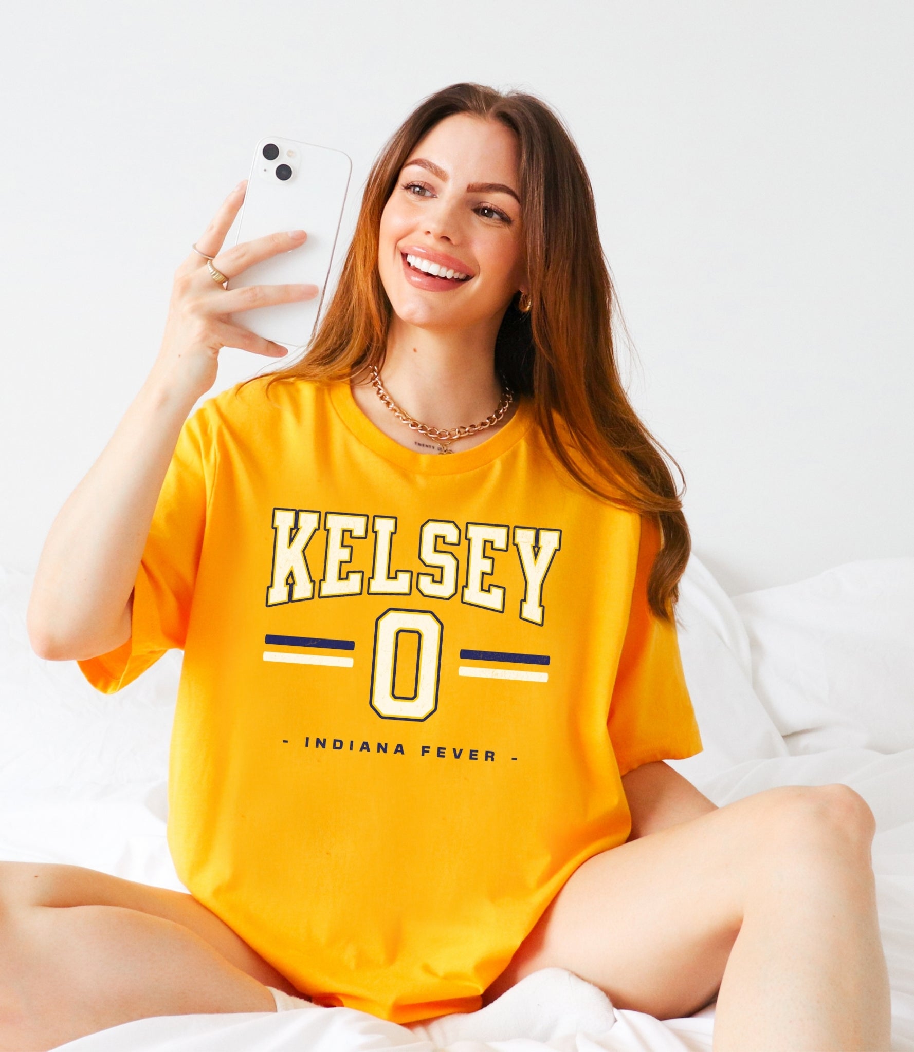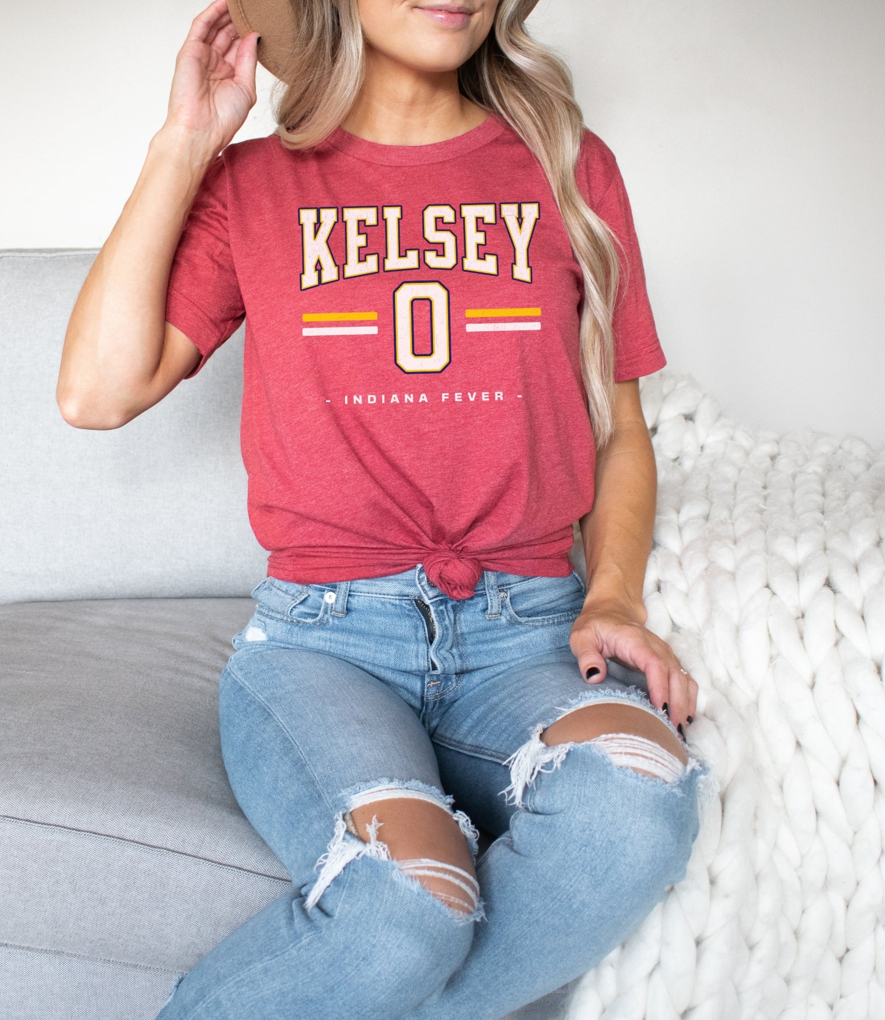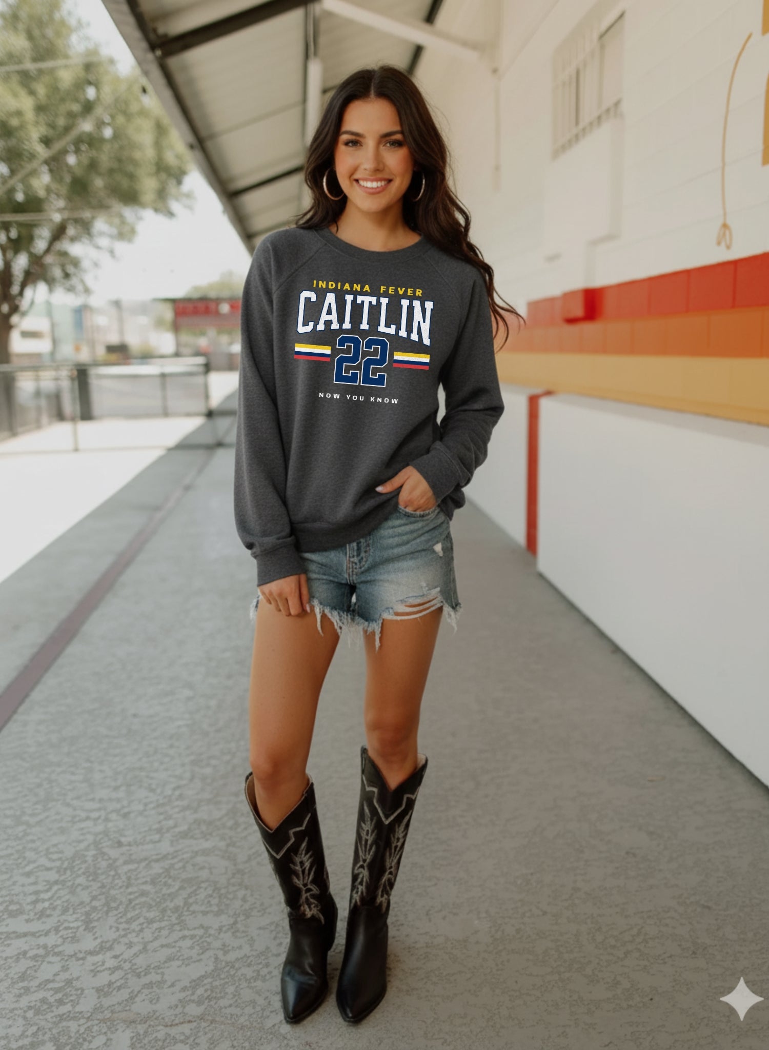 Person wearing a black t-shirt with 'Indiana Fever Caitlin 22 Now You Know' text against a white brick wall.