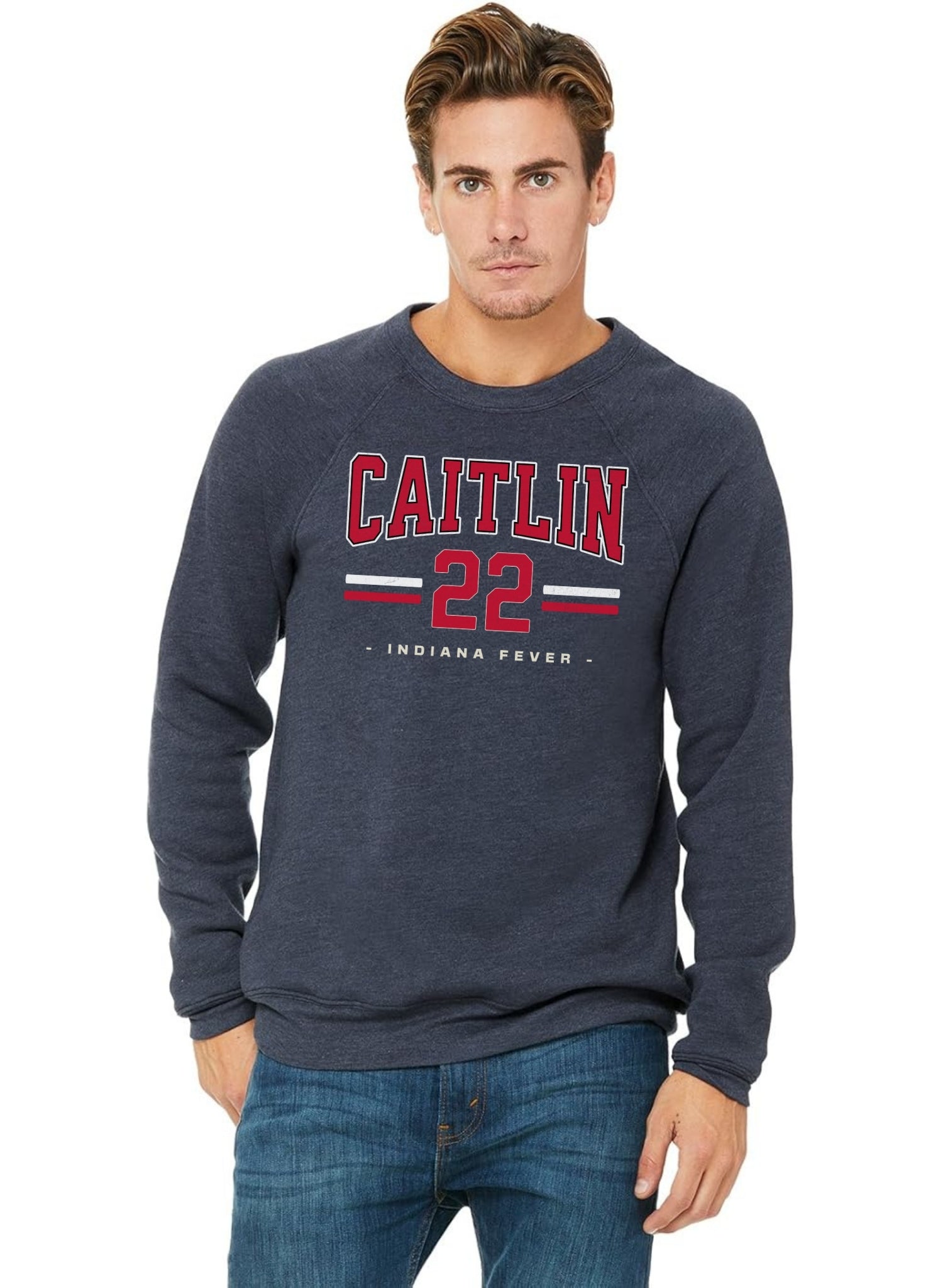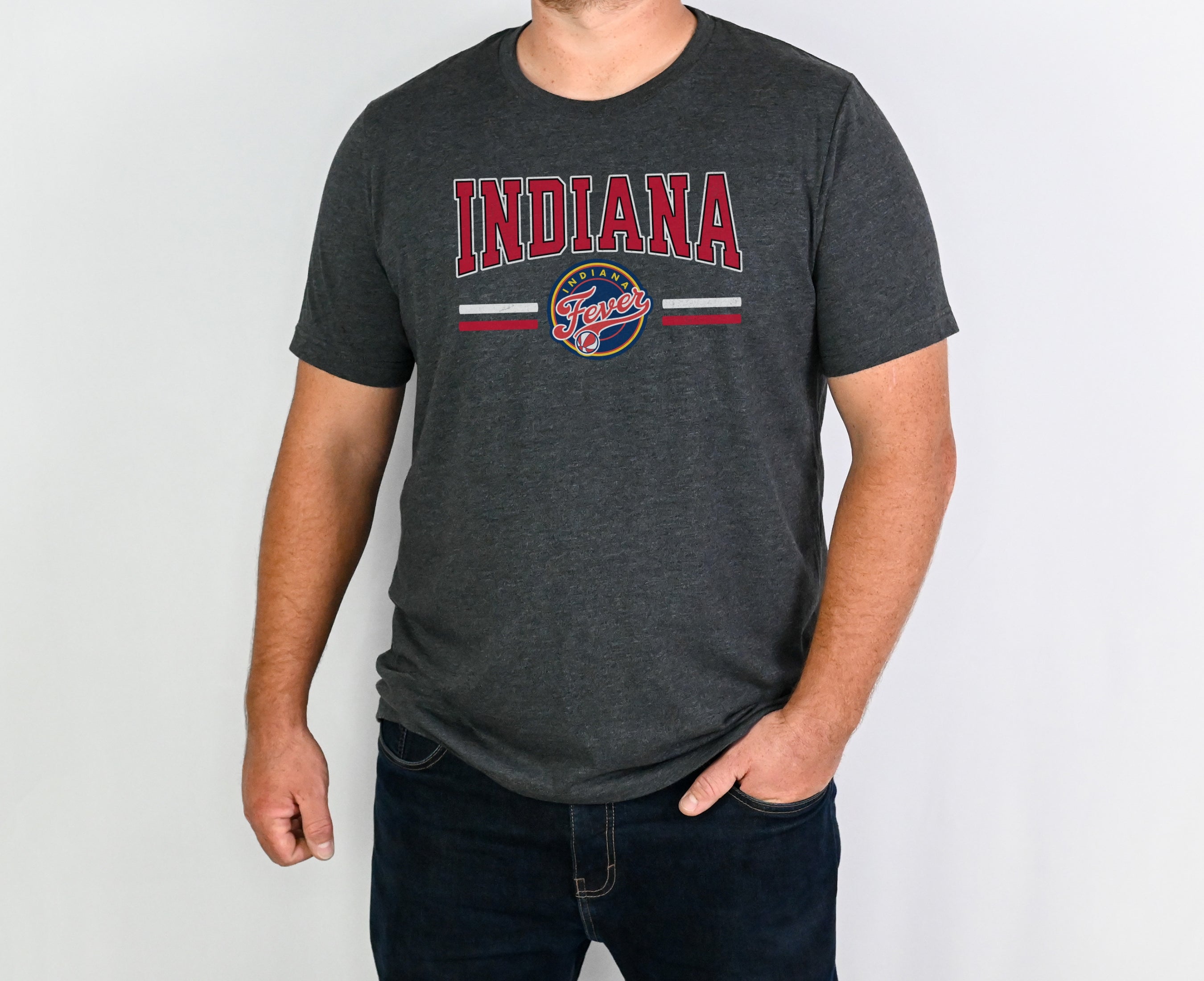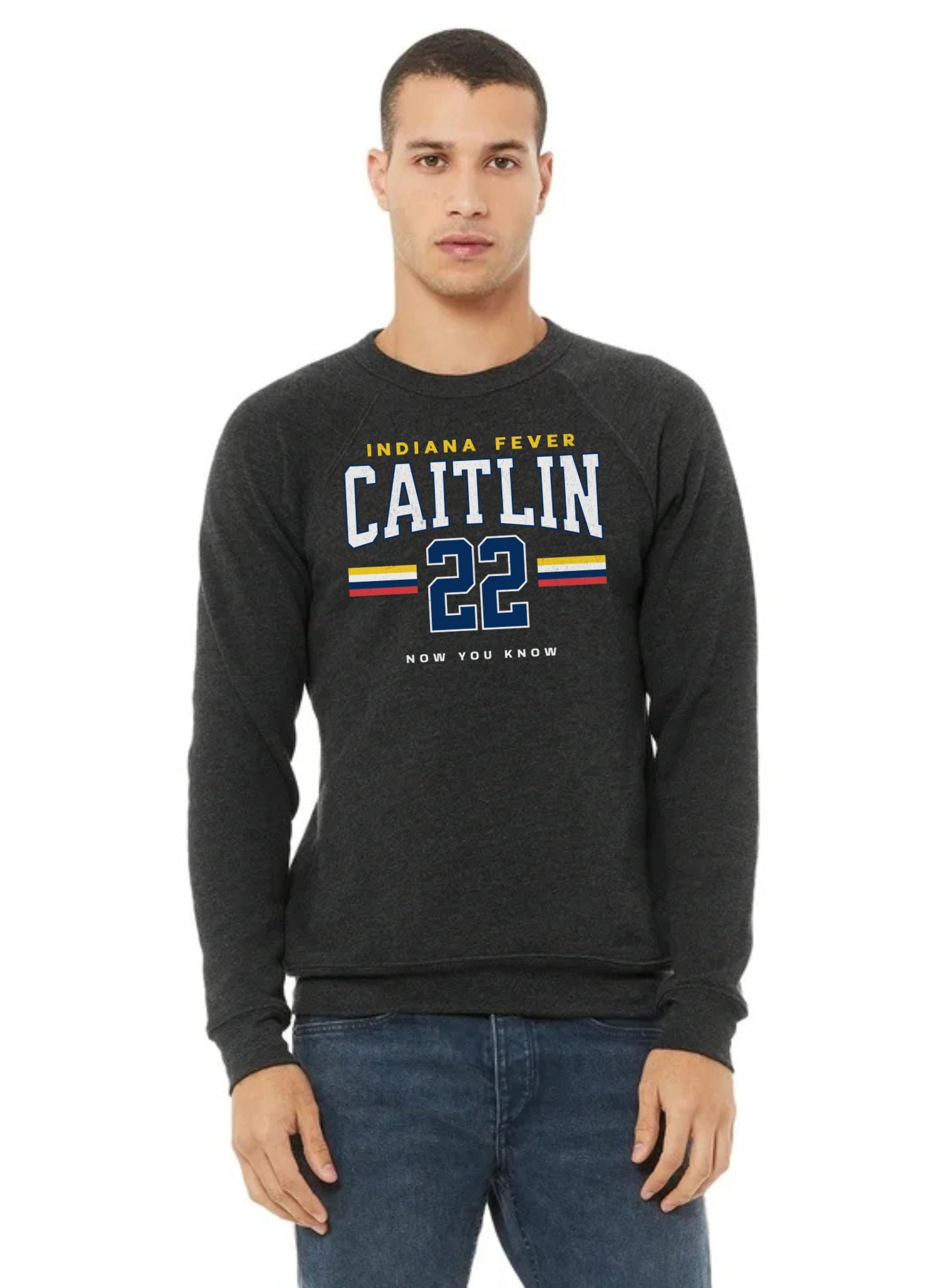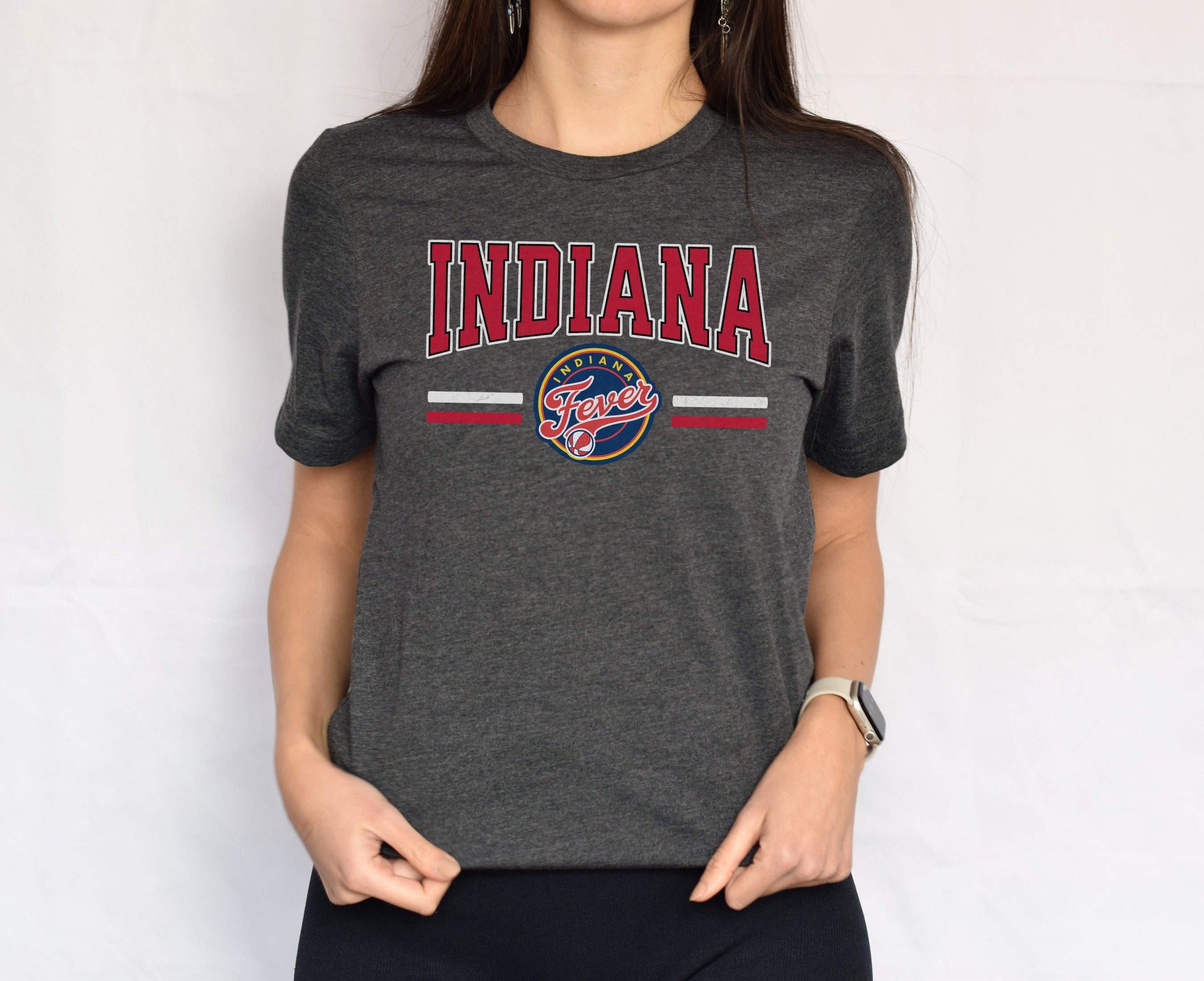 Person wearing a dark gray t-shirt with 'Indiana Fever Caitlin 22' text, standing against a plain background.