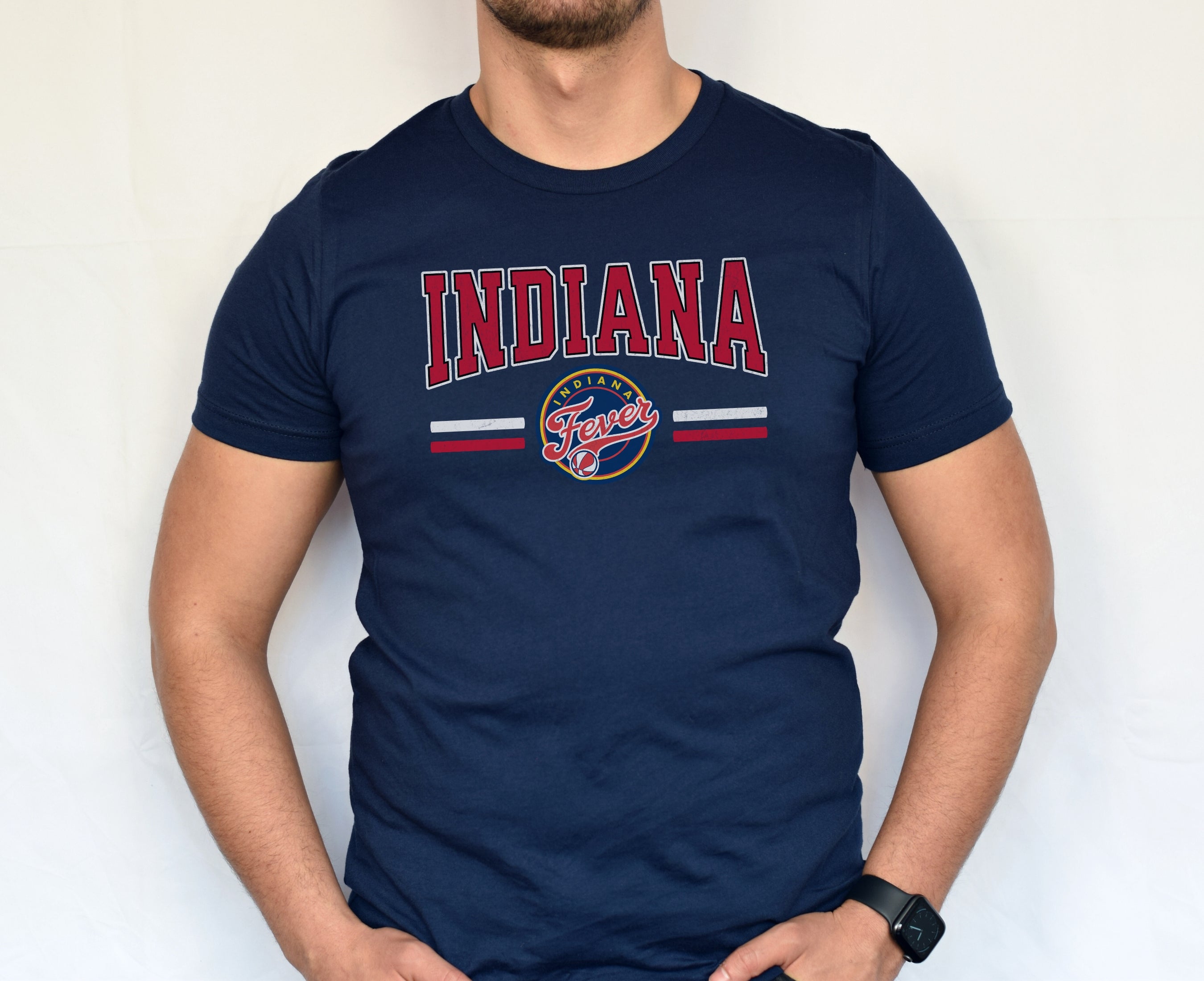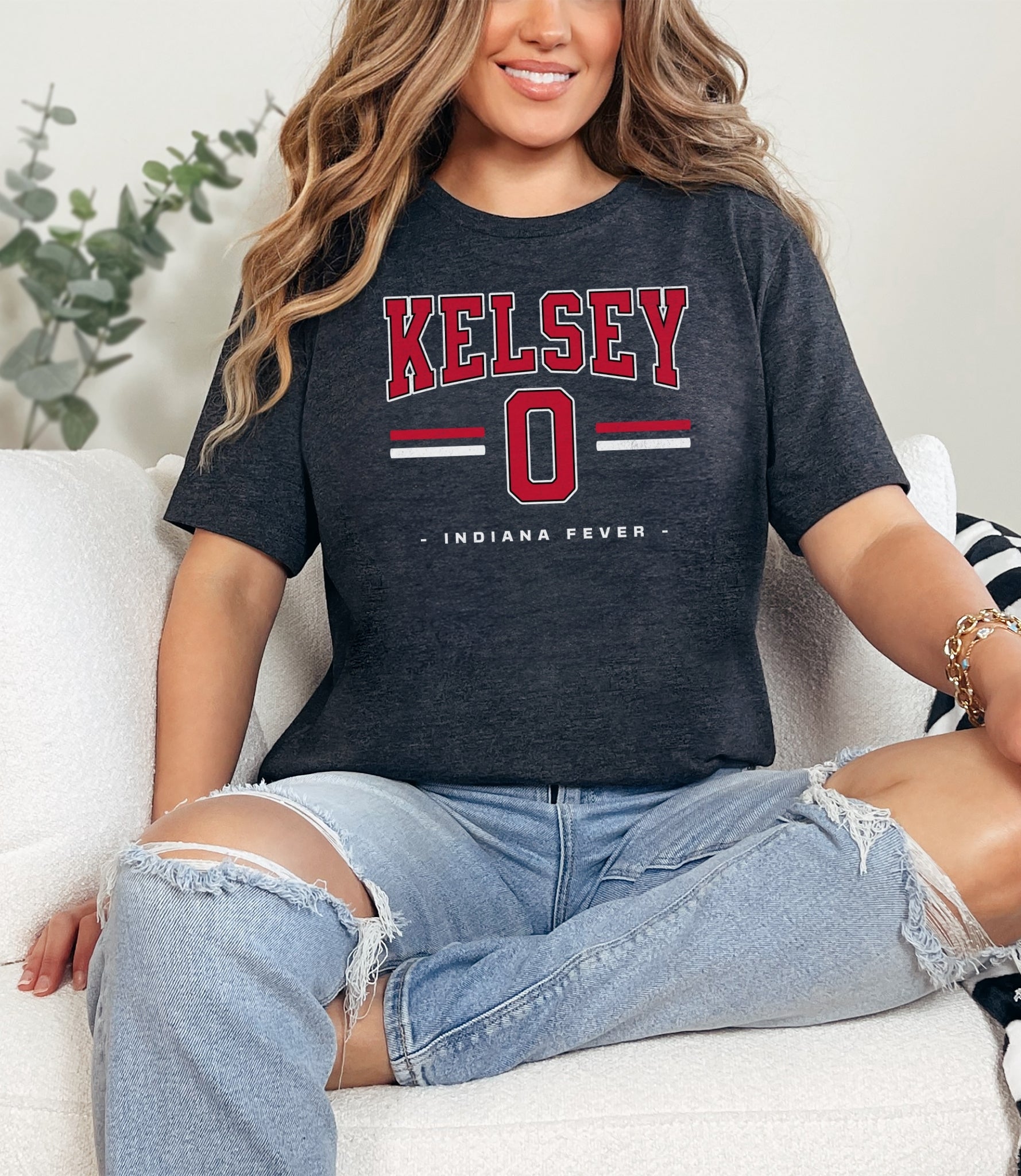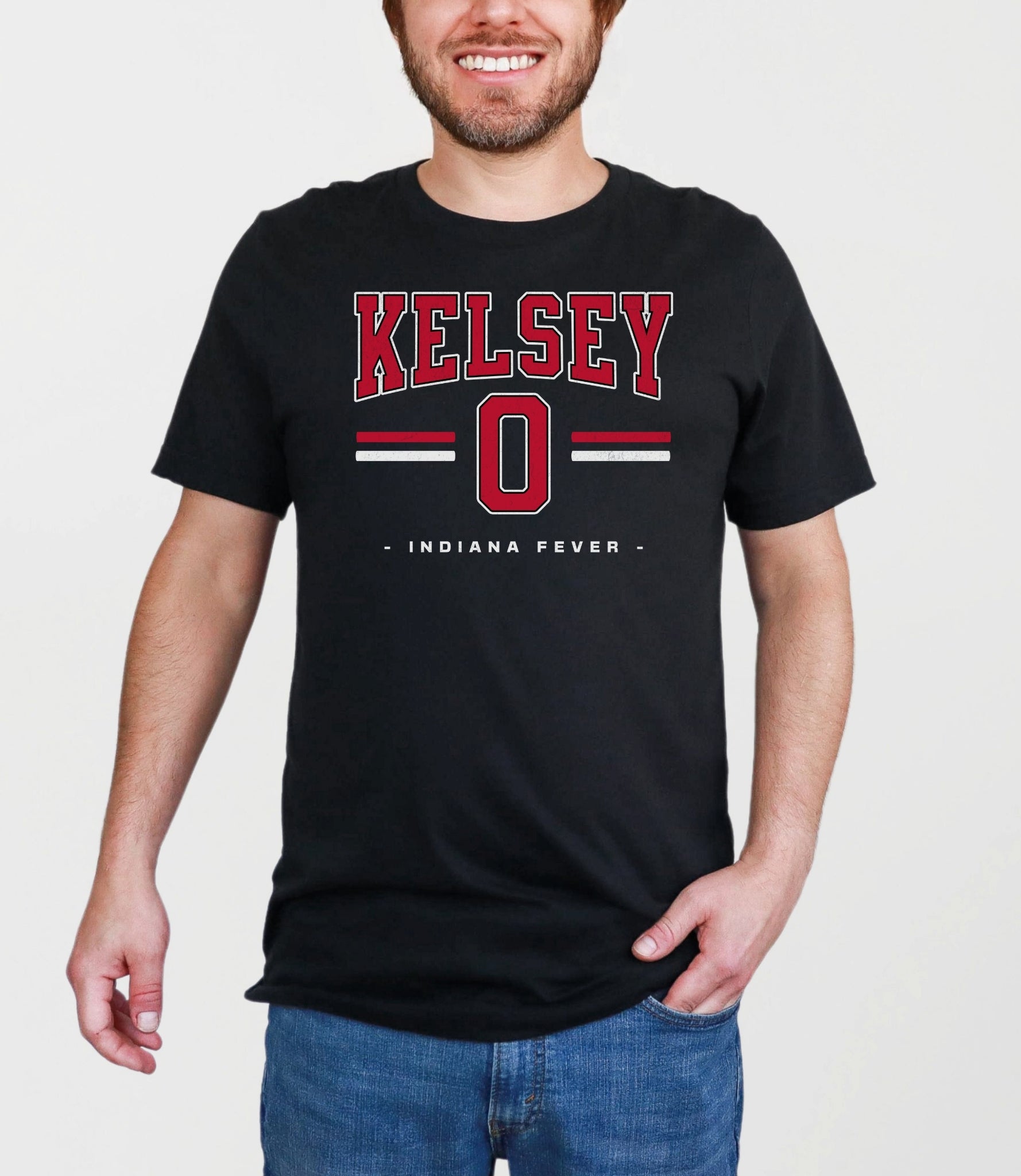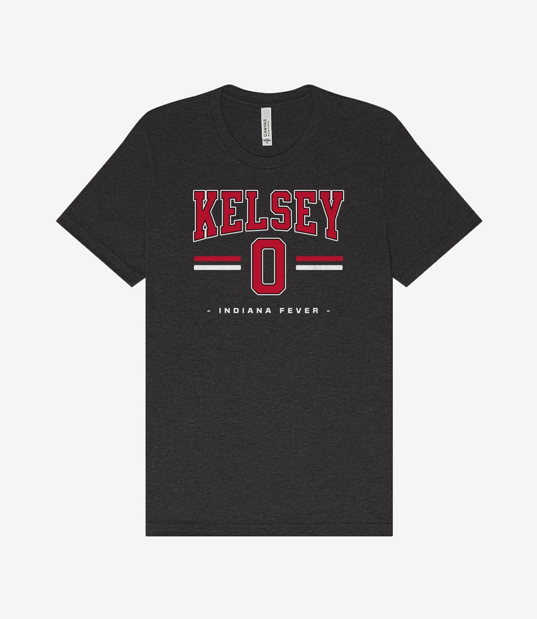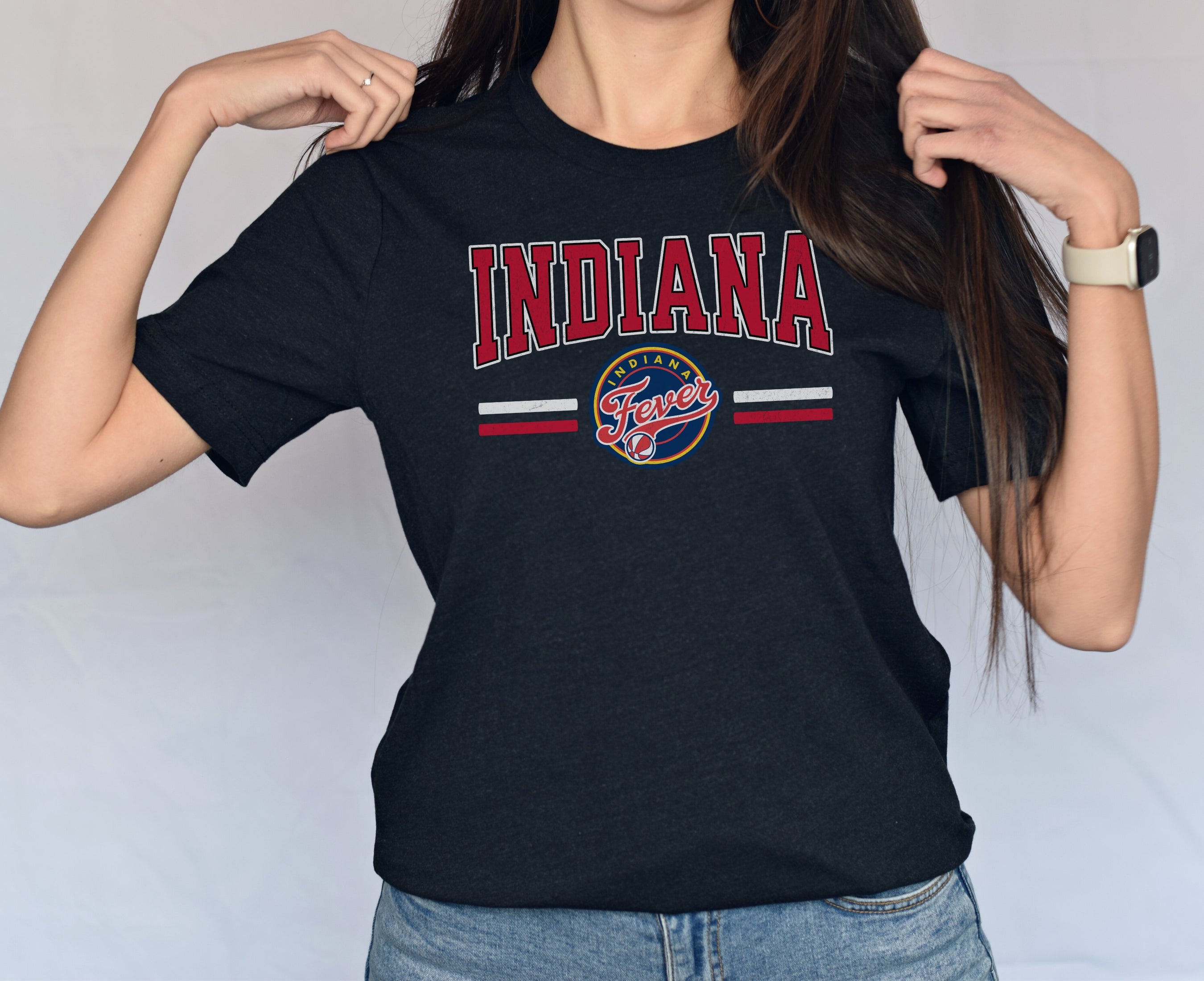 Person wearing a dark gray t-shirt with 'Indiana Fever Caitlin 22' text, standing against a plain background.