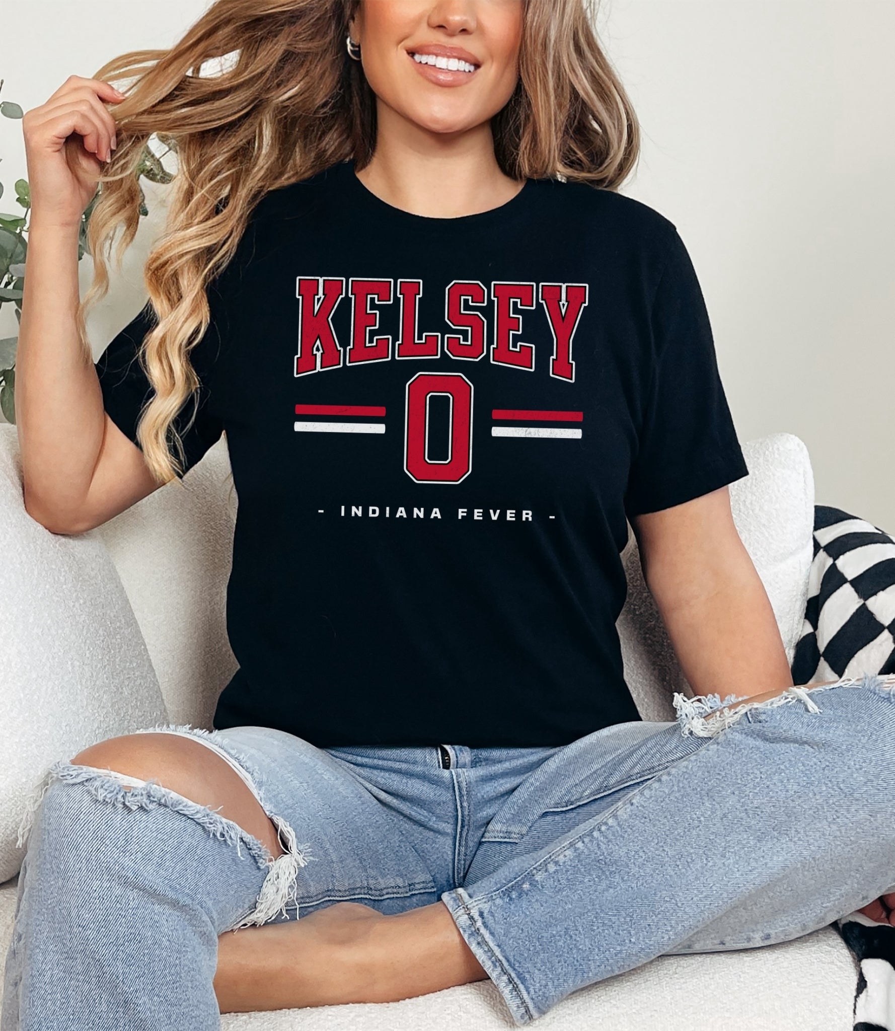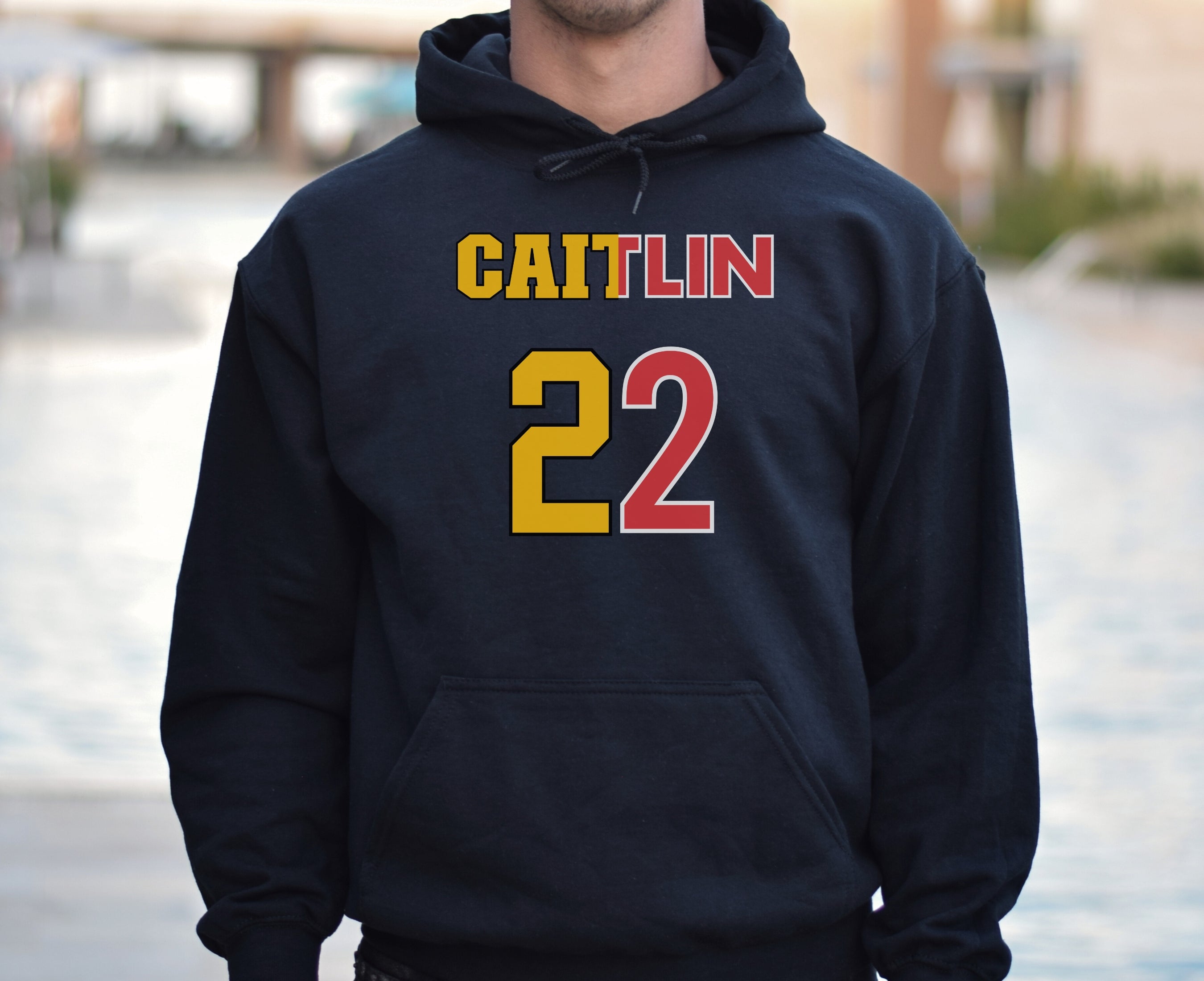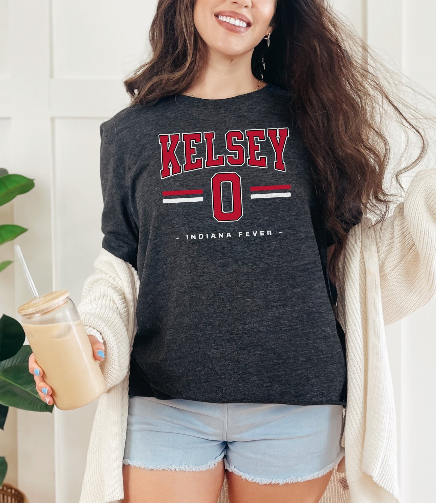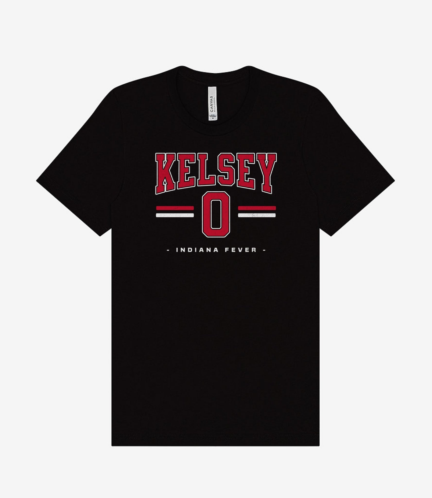 Person wearing a dark gray t-shirt with 'Indiana Fever Caitlin 22' text, standing against a plain background.