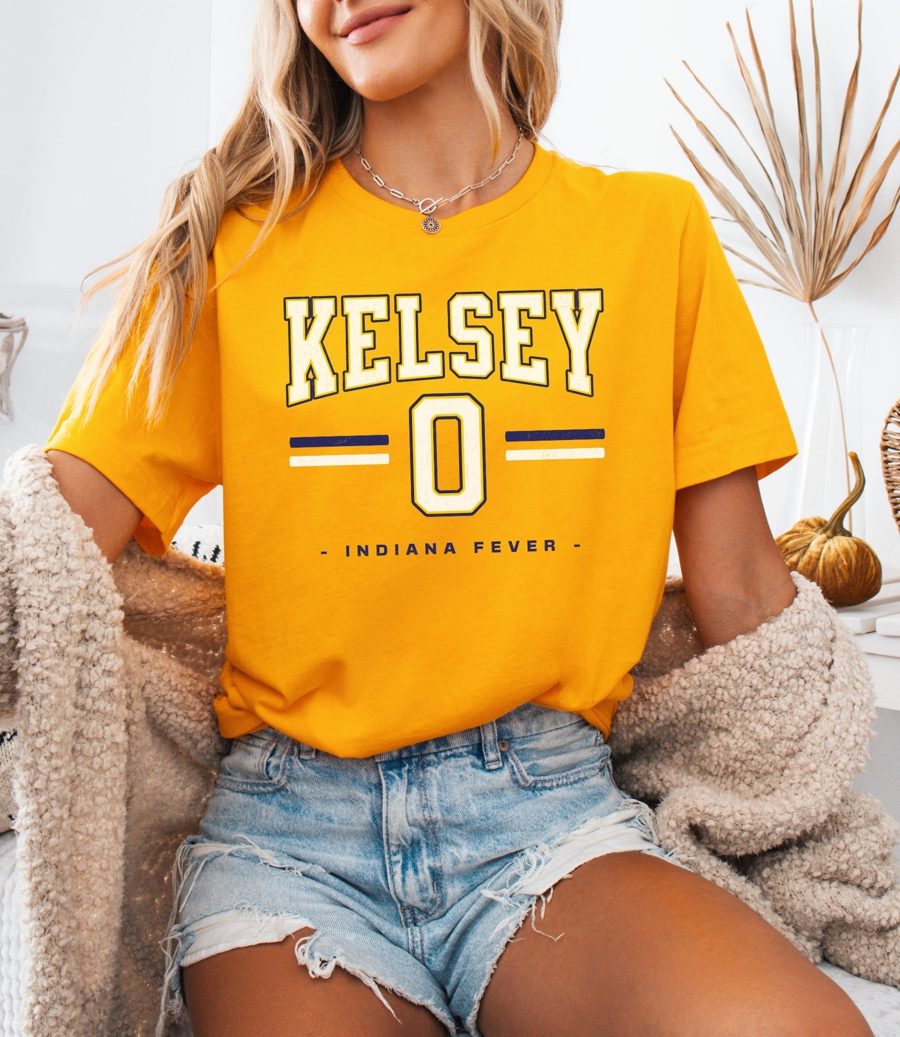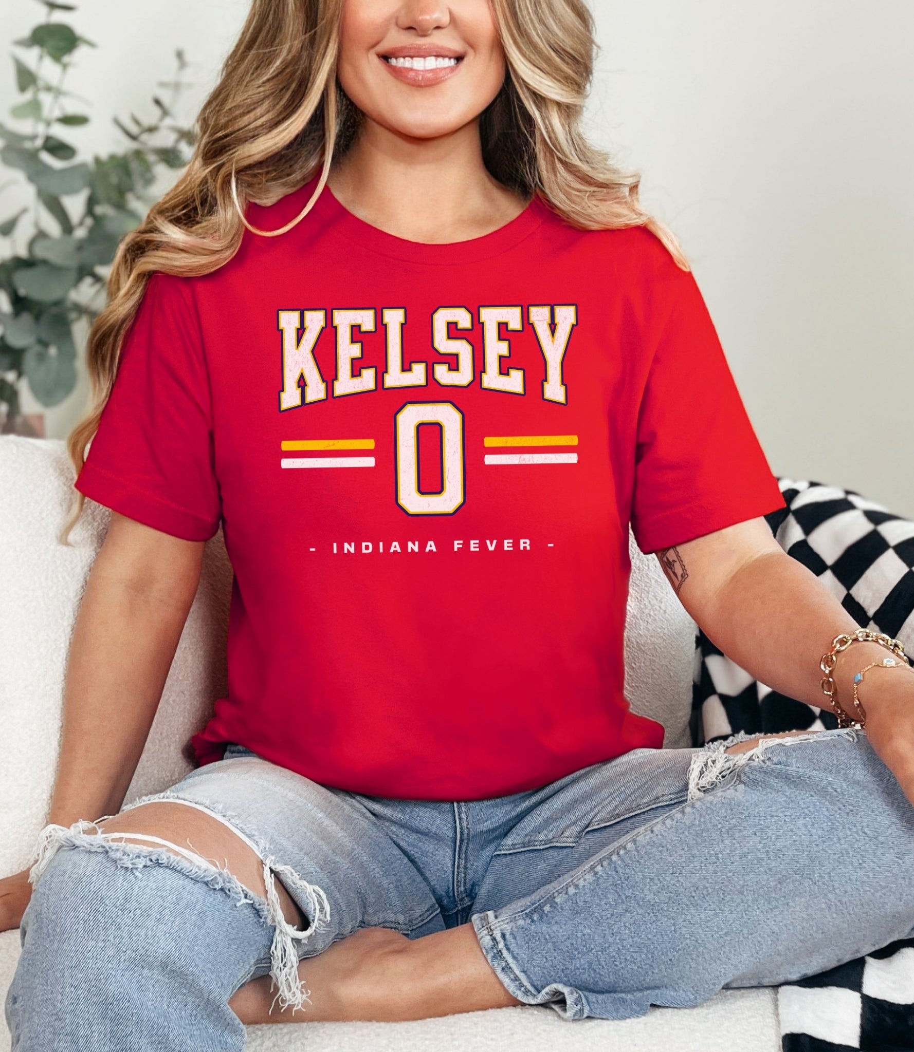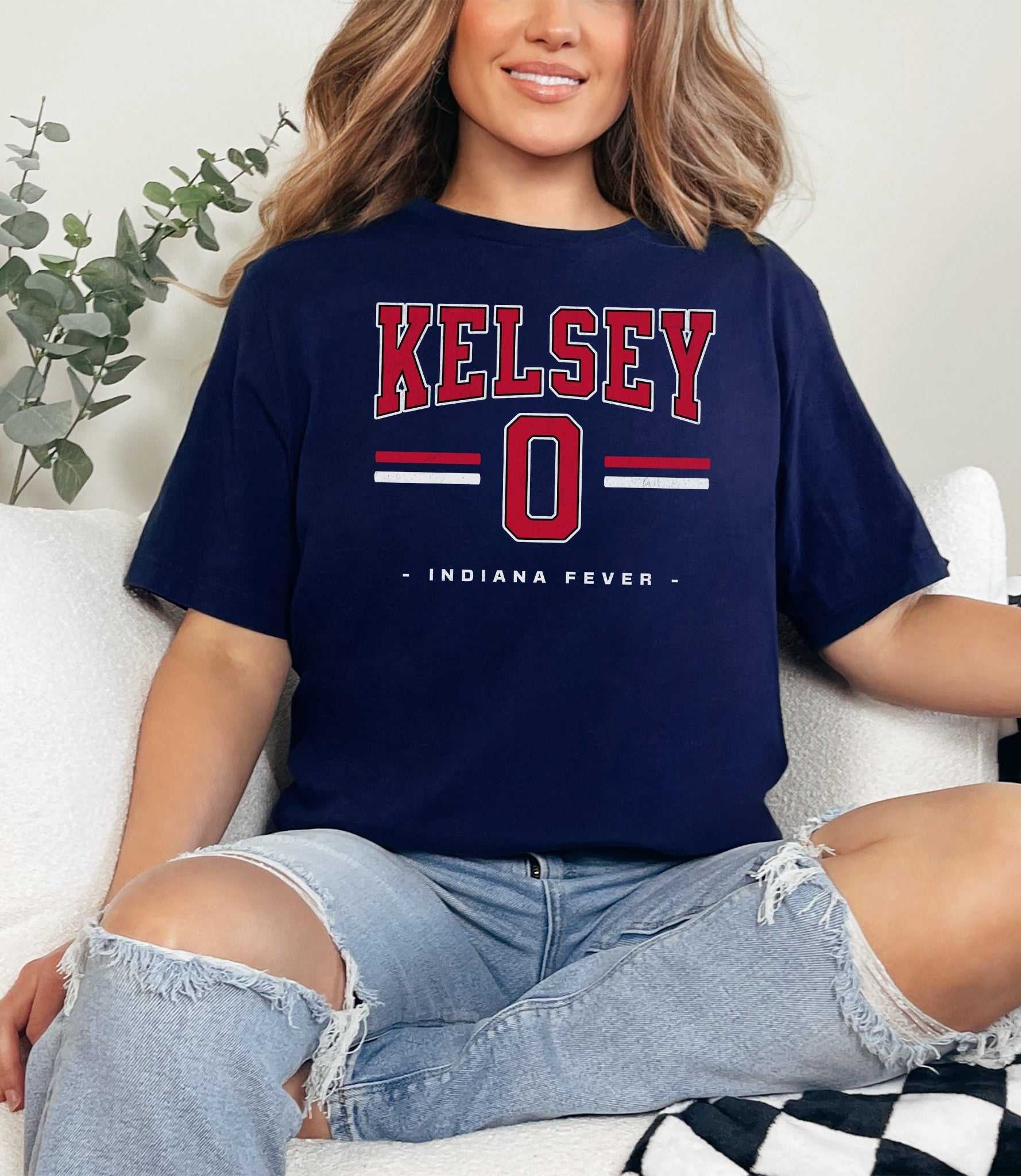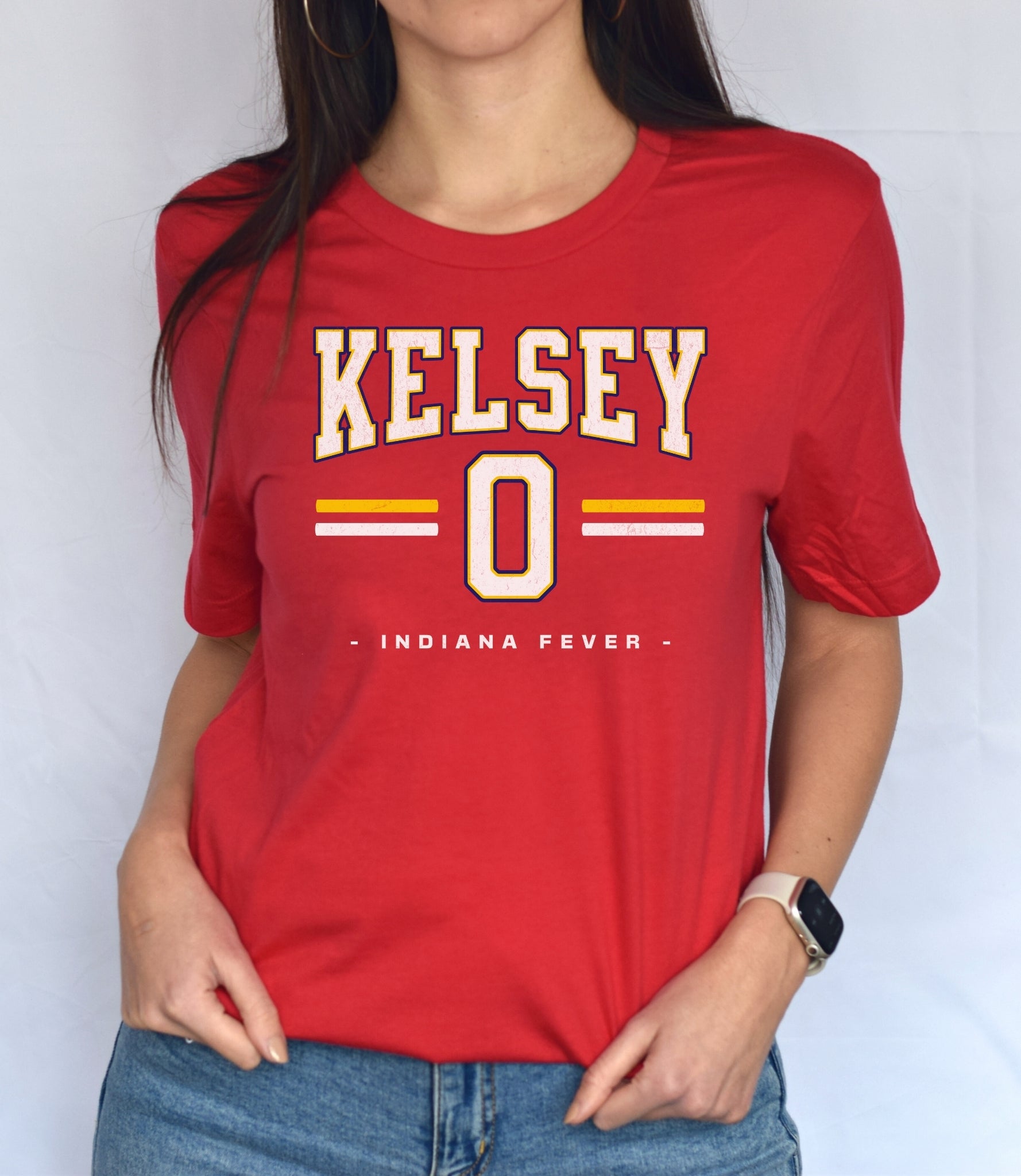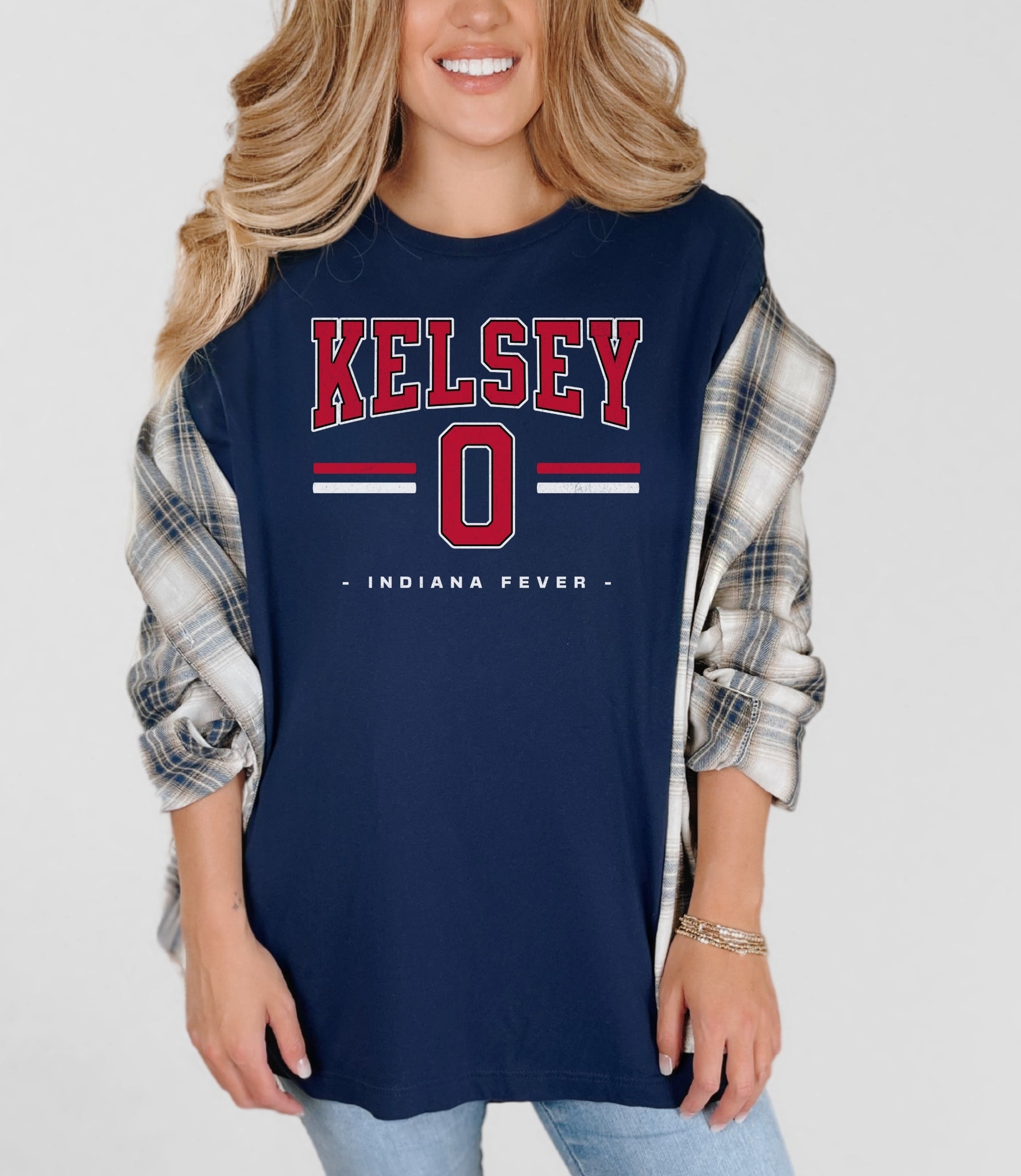 Person wearing a dark gray t-shirt with 'Indiana Fever Caitlin 22' text, standing against a plain background.